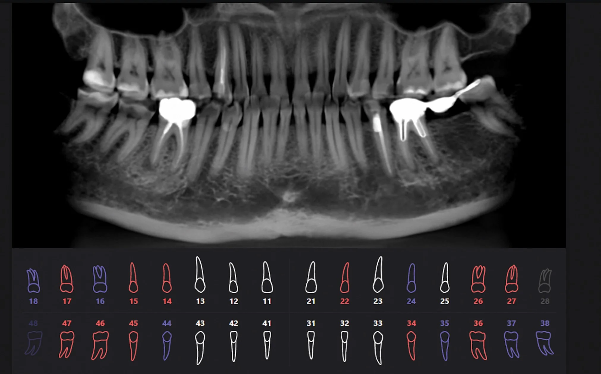 Красным цветом показаны проблемные зубы, синим цветом — зубы с пломбами или ортопедическими конструкциями, белым цветом — здоровые зубы.